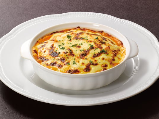 海老とチキンのマカロニグラタン 1,080円(税込1,188円)海老とチキンがたっぷり入ったグラタンです。チーズをかけてこんがりと香ばしく焼き上げました。クリーミーなソースがマカロニにからみます。軽食としてもおすすめの一品です。