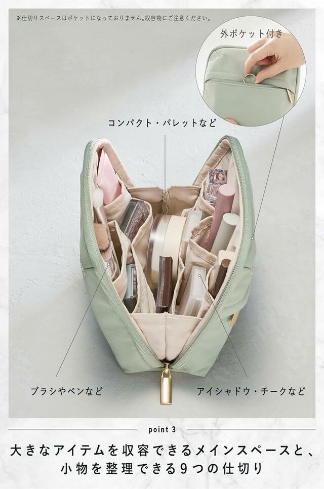 仕切りが多いため、使ったあとも戻す場所に迷いにくく、整理整頓が自然と習慣化。旅先だけでなく、日常使いのポーチとしても活躍します。