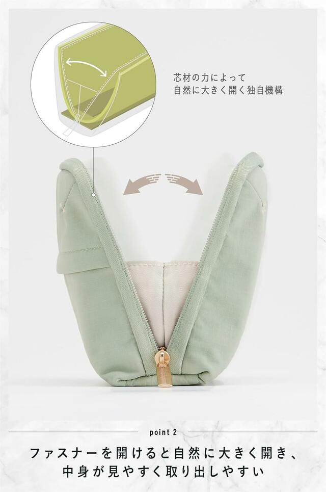 本製品の最大の特長は、独自開発の芯材構造により、ファスナーを開けると自然に大きく開いて自立する構造です。台の上に置くだけで安定し、ポーチを押さえなくても中身を確認できます。