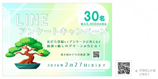 このたび、「埼玉みどりのポータルサイト」の年間アクセス回数が10万件を超えたことから、さらに多くの方に御活用いただけるサイトとするためのアンケートを実施することとしました。アンケートにお答えいただいた方には、本県とゆかりの深い「盆栽」を抽選でプレゼントします。令和7年に開村100周年を迎えた大宮盆栽村など盆栽文化が根づく埼玉県ならではの“癒しのグリーン”を通じて育てる楽しみ、自然とのつながりを感じていただけます。多くの皆様の御参加をお待ちしています。