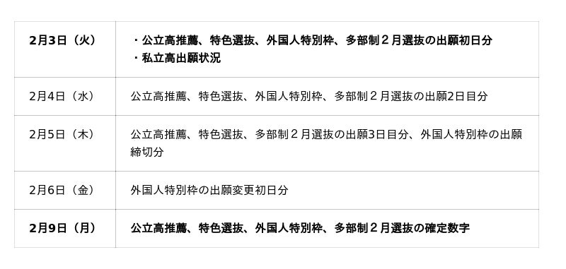 公立高校は、推薦入試(専門学科、普通科コース、普通科単位制、総合学科、連携型)、特色選抜、多部制2月選抜などの出願状況を複数回にわたって速報します。