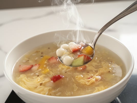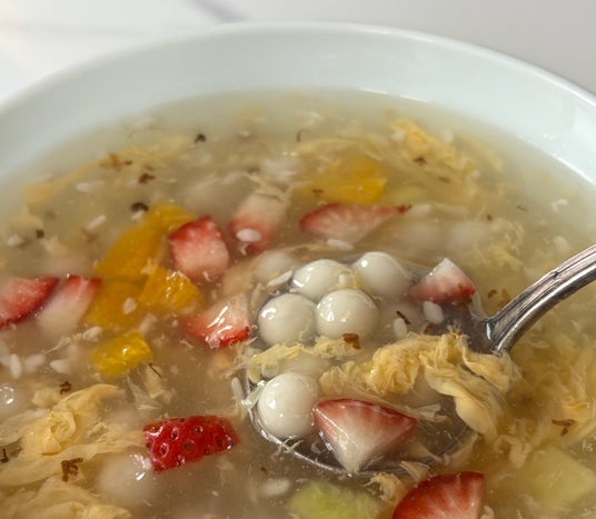 温かいフルーツ入り酒釀団子お食事の締めくくりにふさわしい、温かいデザートスープです。発酵させたもち米「酒釀(チューニャン)」のほのかな酸味と優しい甘みに、フレッシュなフルーツの香りを添えました。もちもちとした白玉の食感とともに、心安らぐひとときをお楽しみください。
