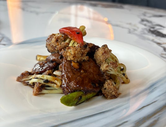 和牛とカリフローレの豆豉炒め厳選された和牛の脂の甘みと、コリコリとした食感が楽しいカリフローレ(スティックカリフラワー)を、風味豊かな豆豉(トウチ)醤で炒め合わせました。シェフの巧みな火入れによる「鍋気(中華鍋の香ばしさ)」と、コクのあるソースが和牛の旨みを引き立てます。