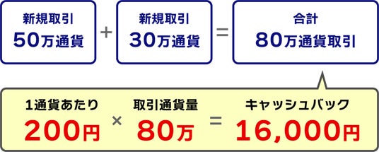 キャンペーン期間中に新規に稼働した対象通貨ペアの自動売買でのお取引で、1万通貨あたり200円、新規取引・決済取引で合計400円をキャッシュバックいたします。キャッシュバック金額の上限はありません。
