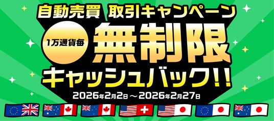 インヴァスト証券株式会社(本社:東京都港区、代表取締役社長:伊藤 誠規、以下「当社」)は、外国為替取引サービス「トライオートFX」において、キャンペーン期間中に新規に稼働した対象通貨ペアの自動売買での取引を対象に、1万通貨当たり最大200円を上限なしの無制限にてキャッシュバックする「自動売買取引キャンペーン」を、2026年2月2日(月)~2月27日(金)まで開催いたします。