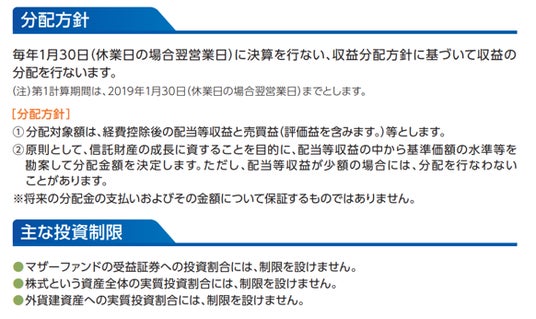 - 分配金は収益分配方針に基づいて委託会社が決定します。あらかじめ一定の額の分配をお約束するものではありません。分配金が支払われない場合もあります。