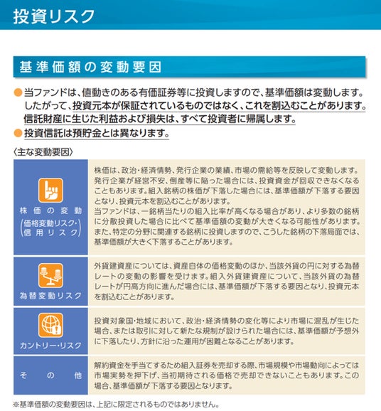 - 投資信託は値動きのある有価証券等に投資しますので、基準価額は大きく変動します。したがって、投資元本が保証されているものではありません。信託財産に生じた利益および損失はすべて投資者に帰属します。投資信託は預貯金とは異なります。