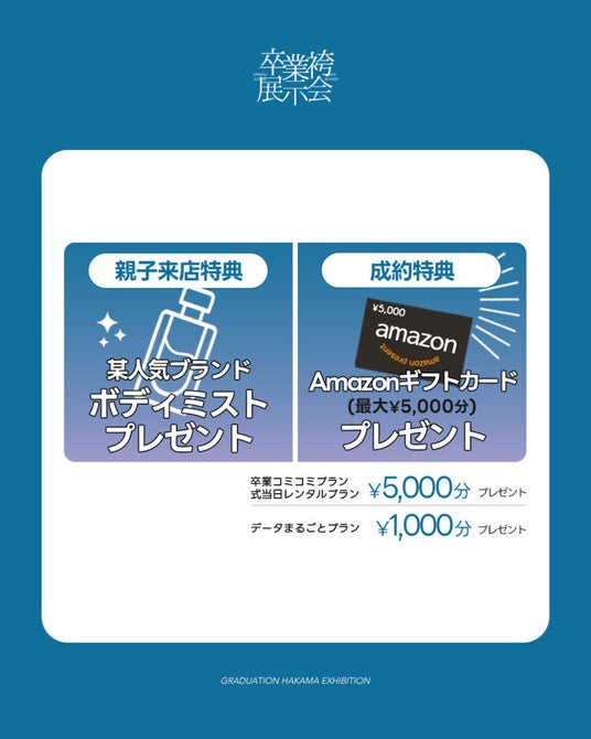 Amazonギフトカード(最大5,000円分)や、人気ブランドのボディミスト(親子来店特典)、さらには66,000円相当の豪華アルバムプレゼントなど、この期間だけの特別なオファーをご用意。