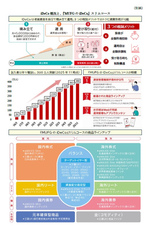 株式会社三菱UFJフィナンシャル・グループ(代表取締役社長 亀澤 宏規、以下 MUFG)は、連結子会社である株式会社三菱UFJ銀行(取締役頭取執行役員 半沢 淳一、以下 三菱UFJ銀行)にて、個人型確定拠出年金(愛称:iDeCo)における、『MUFGのiDeCo』の新コース「スリムコース」を2026年3月5日にリリースします。