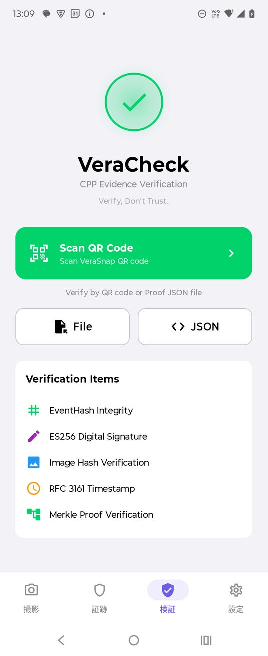 Android版VeraSnapは、iOS版と完全な相互運用性を持ち、CPP(Capture Provenance Profile)仕様v1.5に完全準拠しています。撮影された証拠データは、プラットフォームを問わず同一の検証基盤で真正性を確認できます。