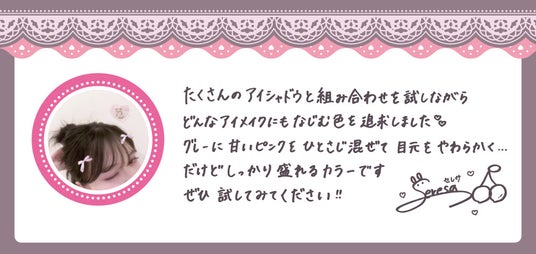グレーベースの高発色カラーで目元にしっかりと存在感を与えながら、ほんのりピンクを効かせた絶妙なバランスで、「甘さを感じて、でもしっかり盛れる」目元を叶えるカラーです。