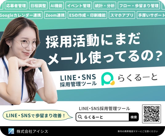 株式会社アイシス(本社:東京都渋谷区、代表取締役:政平秀樹、以下「アイシス」)が提供する採用管理ツール「らくるーと」は、埼玉高速鉄道の全車両にドア広告ステッカーの掲載を開始したことをお知らせいたします。