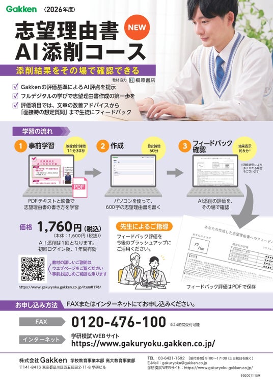 「大学入試面接対策映像講座」とGakkenが販売する添削教材「志望理由書シリーズ」や「小論文シリーズ」をセットで採用していただいた場合、「大学入試面接対策映像講座」を割引販売するキャンペーンを実施中です。受付は2026年3月31日(火)まで。キャンペーン内容や申し込み方法は、以下リンク先よりPDFをご確認ください。
