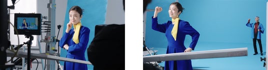 撮影では、上戸さんが友田さんのノリに合わせてリズムを取り、動きがぴったりとシンクロすると、思わず笑みがこぼれる場面もありました。撮影の合間には、TVCM初出演で緊張気味の友田さんに、上戸さんが上京時のエピソードについて聞くなど、和やかな交流もありました。また、撮影の合間には、遠近法で上戸さんが自身の手のひらに友田さんを乗せて遊ぶ一コマも。終始、二人の息の合った掛け合いに和まされ、人柄の良さが伝わる撮影現場となりました。