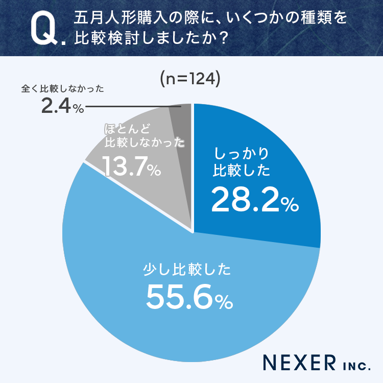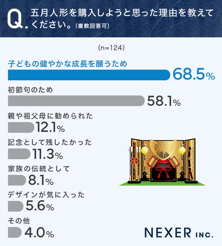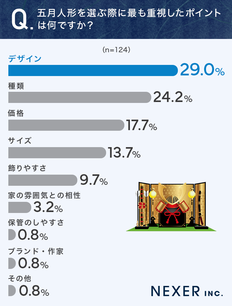 そこで今回は、節句人形を販売する「浅草橋人形工房すずなり」と共同で、事前調査で「五月人形を購入したことがある」と回答した全国の男女124名を対象に「五月人形を選ぶポイント」についてのアンケートを実施しました。