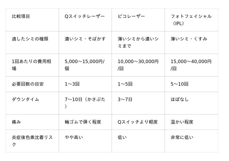 Qスイッチレーザーは濃いシミに対して1回で高い効果を発揮しますが、照射後7~10日程度かさぶたができるダウンタイムがあります。ピコレーザーはより短いパルス幅でメラニンを細かく粉砕するため、炎症後色素沈着のリスクが低く、ダウンタイムも短い傾向にあります。フォトフェイシャル(IPL)は穏やかな作用で複合的な肌悩みを改善できますが、濃いシミには効果が限定的です。