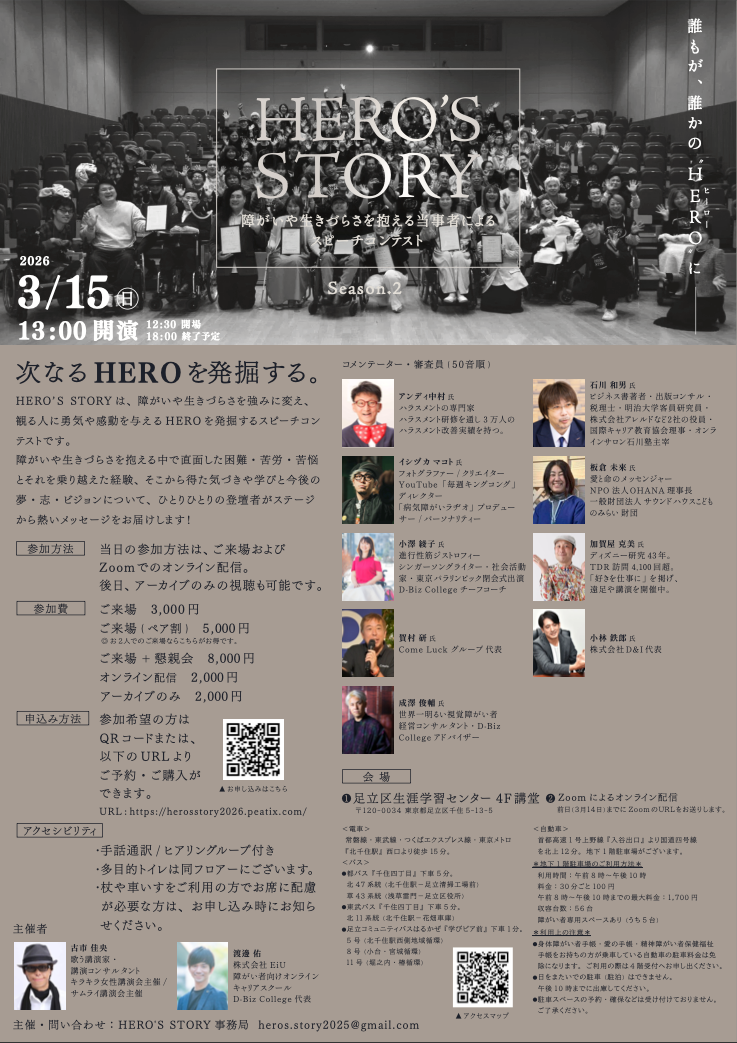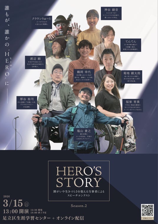 株式会社EiU(本社:東京都墨田区、代表取締役:渡邊 佑)は、2026年3月15日(日)、東京都足立区生涯学習センター 講堂にて、障がい当事者によるスピーチコンテスト『HERO’S STORY(ヒーローズストーリー)』第2回を開催いたします。