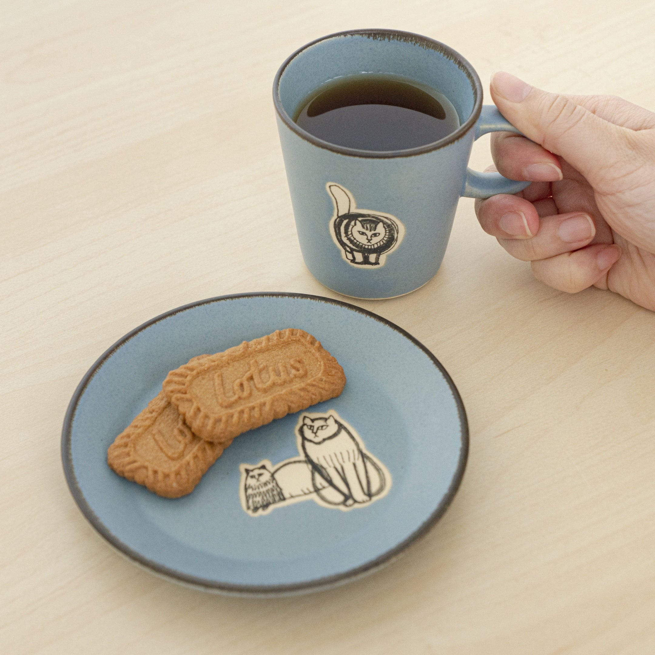 益子焼でつくられた、カップとプレートのセット。マットな釉薬の質感に、スケッチねこの部分のみ撥水加工を施しました。プレートはソーサーとしてもお使いいただけます。