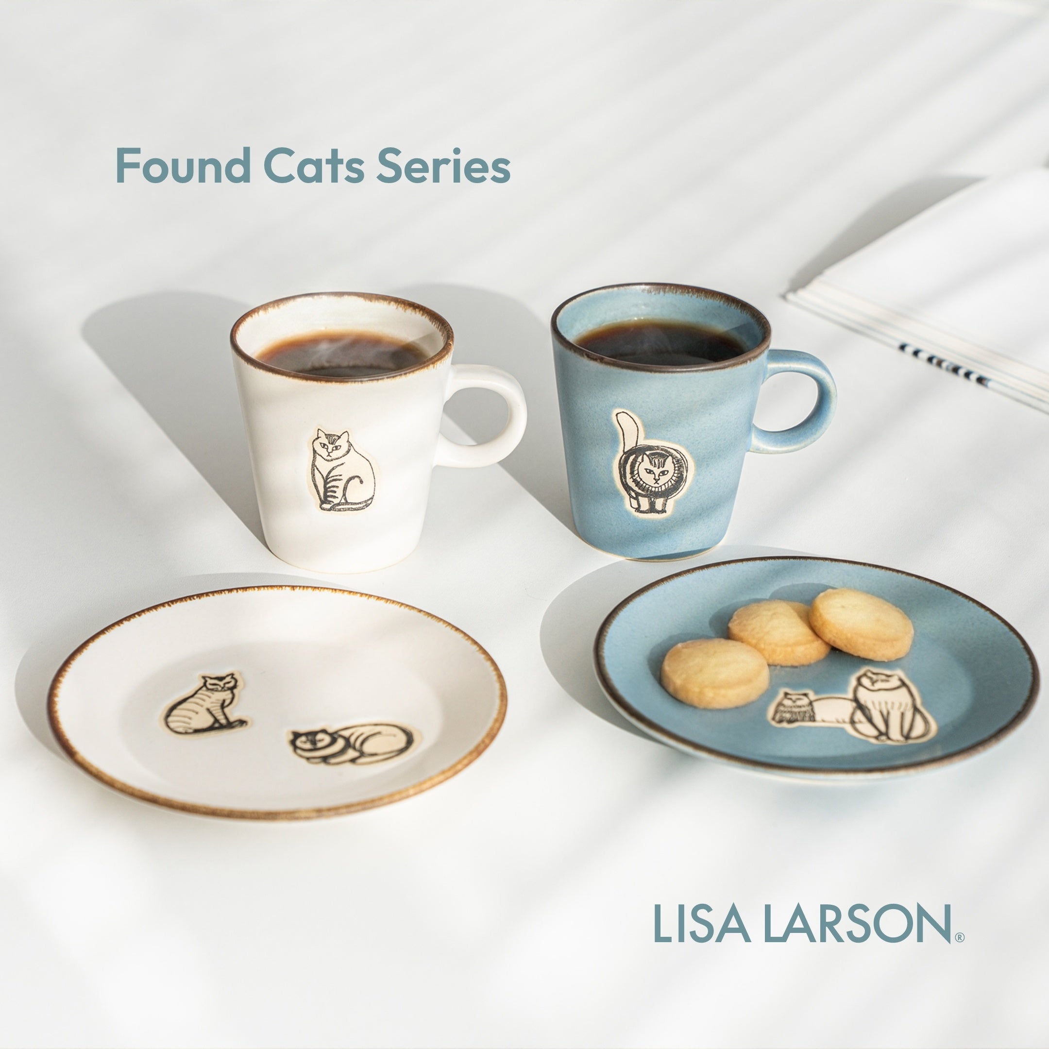 オンライン販売の開始を記念して、トンカチストア限定の特別なセットをご用意しました。 展覧会グッズの中でも人気の高い「益子焼のカップ&プレート」の2色(白・錆青)をペアにし、特典としてトンカチストアオリジナルの「リサ・ラーソンのラッピング巾着」をお付けしてお届けします。■ 【期間限定巾着付】カップ&プレートペアセット(Found Cats Series・益子焼)