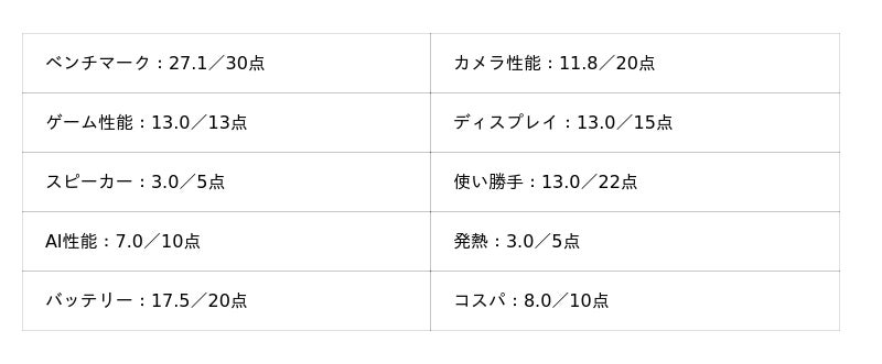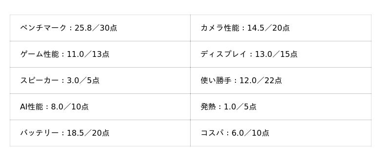 - カメラ性能:20点満点