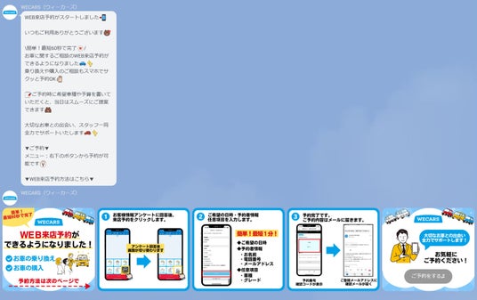WECARSでは、店舗ごとのLINE公式アカウントを保有しております。お友だち登録していただけますと、LINEのリッチメニューからも来店予約が可能となります。LINEでは、お得なクーポンやキャンペーンの案内も行っております。ぜひご活用ください。