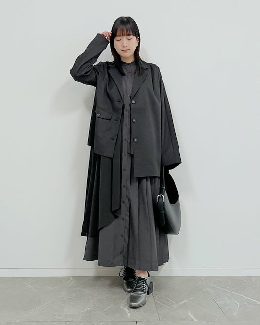 一枚で圧倒的な存在感を放つ、異素材切替のアシメプリーツワンピース。独創的なシルエットがダークトーンの装いに劇的な変化を与え、重さを感じさせない軽やかな動きを演出します。無難にまとめない「私らしさ」が、お祝いの席でも洗練された個性を放つ、地味見え回避を叶える主役級の一着です。kOhAKU異素材アシンメトリープリーツワンピース