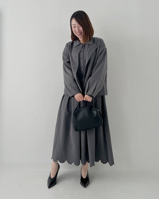 「普通じゃつまらない」そんな私にぴったりのハレの日スタイル。裾から覗くスカラップが、コーデに軽やかな印象を持たせてくれます。杢チャコールの絶妙な色味は、可愛さがパッと光るとっておきの一癖デザイン。カッチリ決めるより、自分らしく心地よく。個性が光る一着で、最高に素敵な一日を。