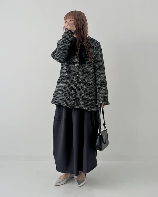 大きなリボンが目を惹く黒ブラウスを主役に、表情豊かなツイードジャケットを羽織った凛とした装い。落ち着いたチャコールのスカートを合わせることで、シックな中にも女性らしい柔らかな品格が漂います。クラシカルな華やぎとマナーを兼ね備えた、大切な一日にふさわしい洗練スタイルです。