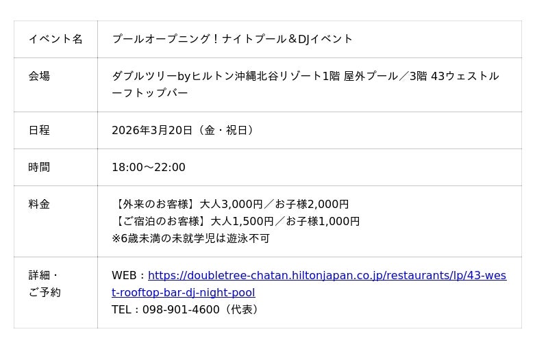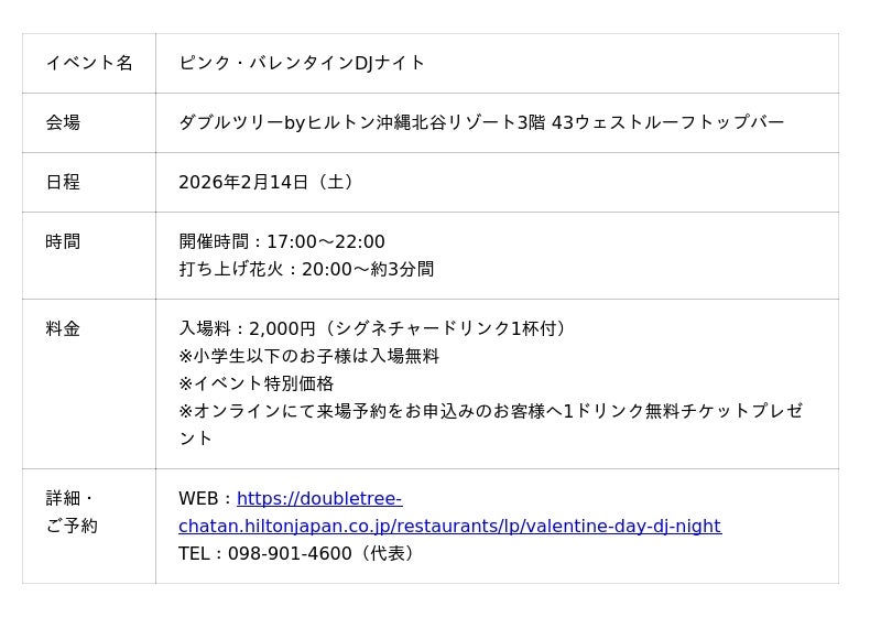 【2026年2月3日】ダブルツリーbyヒルトン沖縄北谷リゾート(北谷町(ちゃたんちょう)美浜(みはま) 統括総支配人 宍倉裕(ししくらゆたか))は、2026年のスタートを華やかに彩る2つのDJイベントを開催いたします。バレンタイン当日に開催する「ピンク・バレンタインDJナイト」と、3月20日(金)に開催する「プールオープニング!ナイトプール&DJイベント」を実施し、特別なひとときをお届けします。