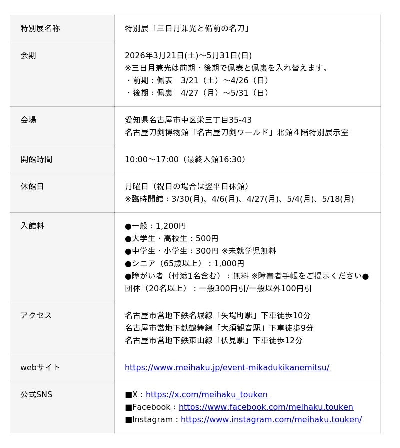 名古屋刀剣博物館「名古屋刀剣ワールド」(愛知県名古屋市、以下当館)では、2026年3月21日(土)~5月31日(日)、特別展「三日月兼光と備前の名刀」を開催します。