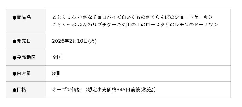 今回のテーマは、地元で愛される名店が提供する「県産フルーツ使用の人気メニュー」。山形県南陽市と米沢市にある人気パティスリー「白いくも」の「さくらんぼのショートケーキ」の味わいを表現した「ことりっぷ 小さなチョコパイ<白いくものさくらんぼのショートケーキ>」と、岡山県瀬戸内市にある珈琲専門店「山の上のロースタリ」の「レモンのドーナツ」の味わいを表現した「ことりっぷ ふんわりプチケーキ<山の上のロースタリのレモンのドーナツ>」が登場します。