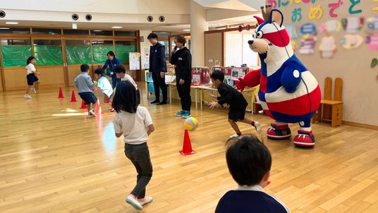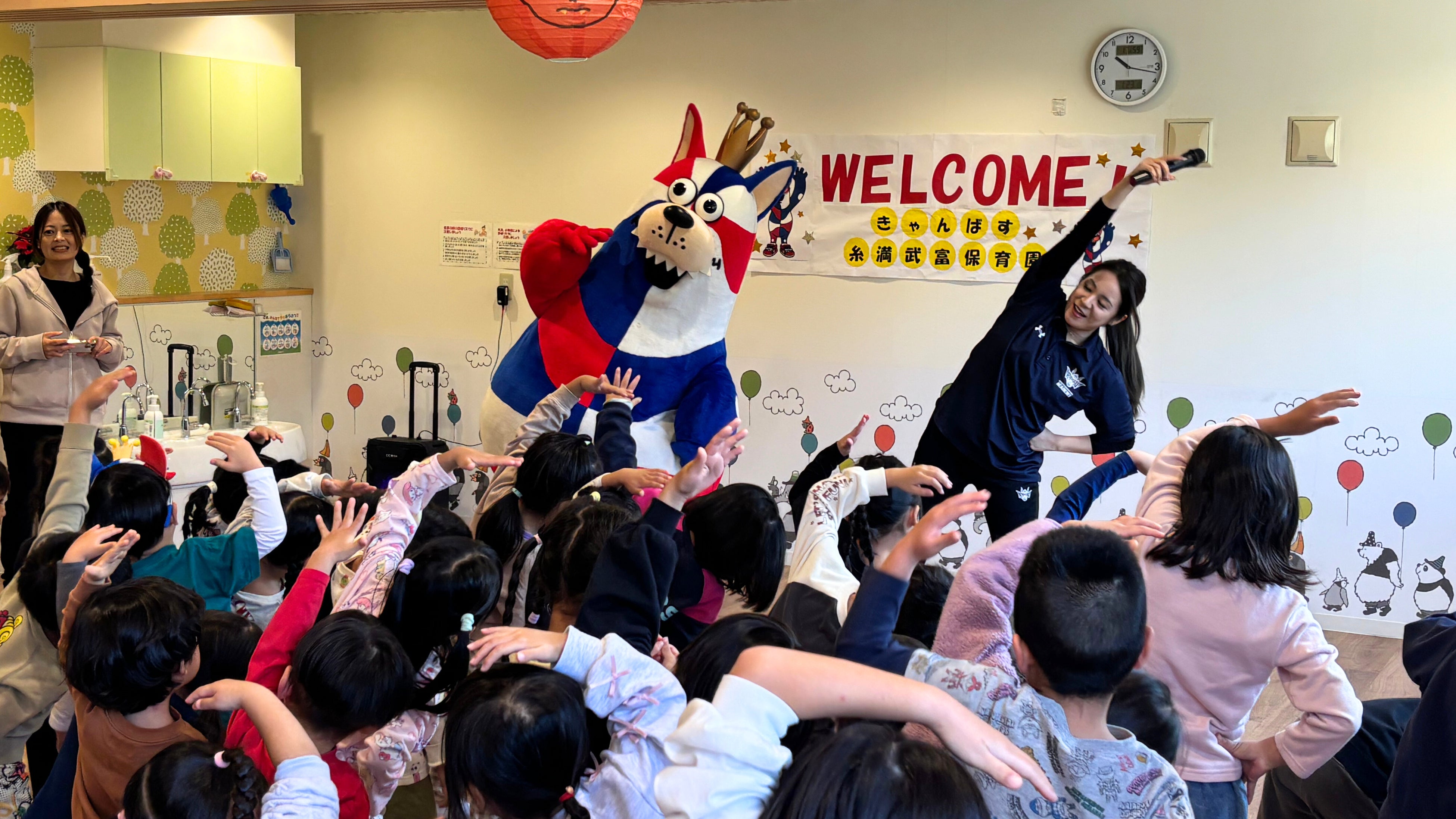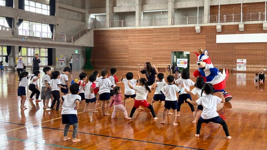 ボール遊びでは、グループでのボールパスやドリブルリレーに、ゴーディーや仲間たちと一緒に挑戦しました。また、ダンス交流会では園内を装飾し、「GO GO KINGS!」の掛け声で温かく迎えていただきました。子どもたちも最初は少し緊張した様子も見られましたが、最後には笑顔でダンスを楽しみ、和やかで楽しい時間となりました。