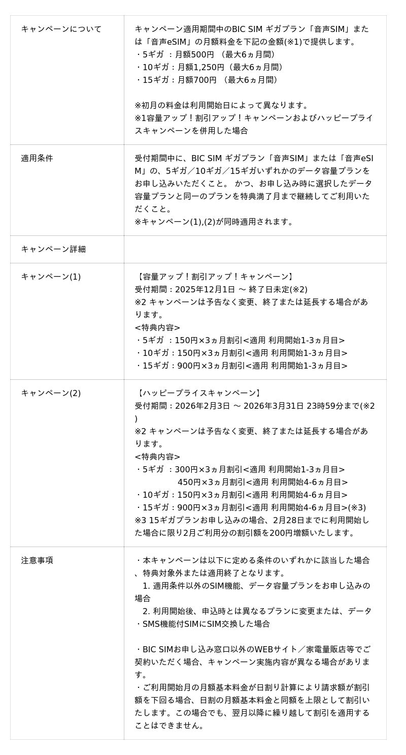 BIC SIM 容量アップ!割引アップ!・ハッピープライスキャンペーン