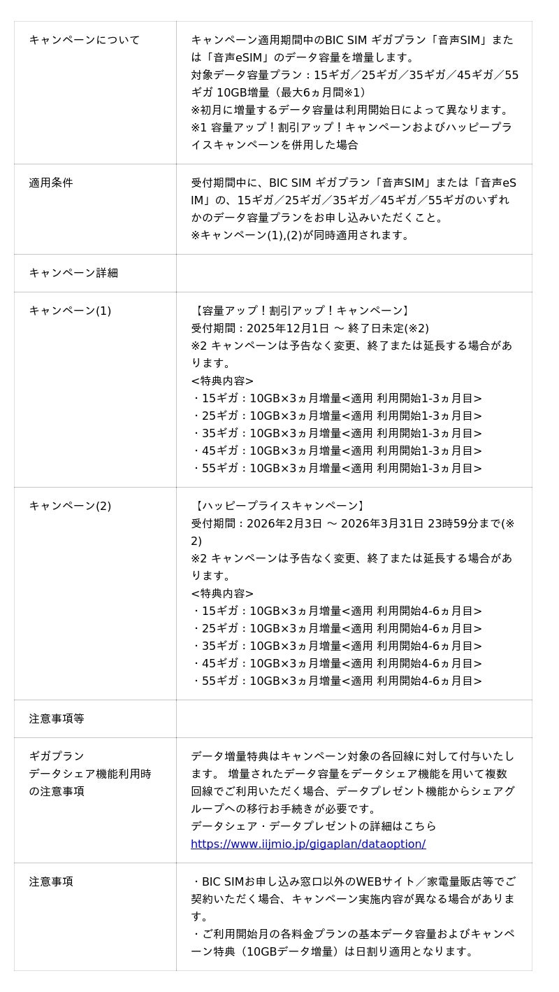 動画視聴やオンラインゲーム、SNS の普及により、スマートフォンのデータ通信量は年々増加傾向にあります。 ビックカメラグループが提供する「BIC SIM powered by IIJ(以下、BIC SIM)」は、こうした大容量データ通信のニーズにお応えし、より多くのお客様に快適な通信環境を提供するため、2026年3月1日より「ギガプラン」の15ギガプランの音声SIM・音声eSIMの月額料金を従来の1,800円(税込)から1,600円(税込)へ値下げいたします。進学や就職などでライフスタイルが変化する春の新生活シーズンに向け、通信費を抑えつつデータをたっぷり使いたいお客様をいち早くサポートいたします。