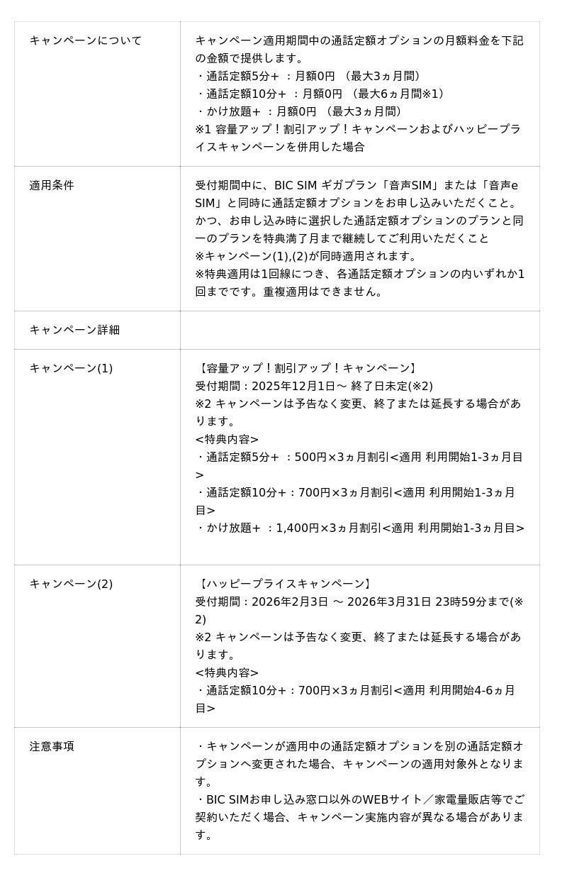 キャンペーン期間中にBIC SIMギガプラン「音声SIM」または「音声eSIM」を新規お申し込みいただき、ご加入時に選択したプラン(および通話定額オプション)を特典満了月まで継続してご利用いただいた場合、月額基本料金の割引、データ容量の増量、および通話定額オプションの割引を、ご利用開始月から最大6ヵ月間(※1)適用します。