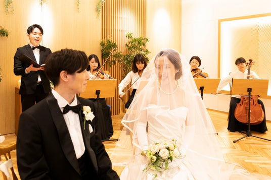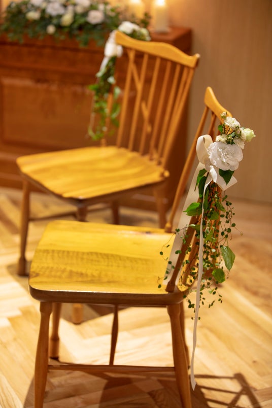 音は、記憶を仕舞ってくれます。この素晴らしい瞬間を包み込むのは、北欧に伝わる祝福の弦楽四重奏。おふたりの新たな物語も、家族が受け継いできた時の重なりも、大切につなぐ、音楽結婚式。古くからデンマークで使われてきた椅子、壁面に咲くダリアのタイシルク、積み重ねてきた時間と最高の今が交差します。