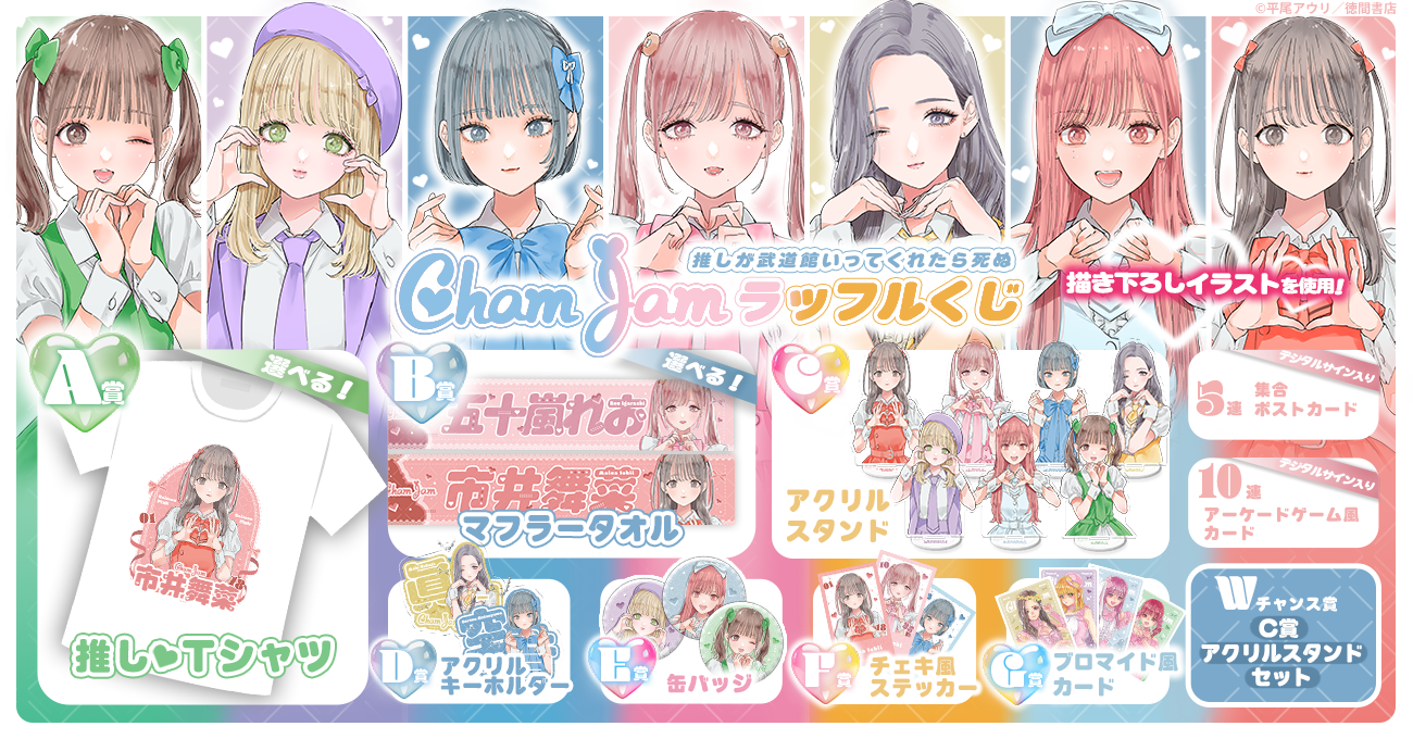 心臓ぶち抜き!!ハートポーズの神ファンサが尊い「『推しが武道館いってくれたら死ぬ』ChamJamラッフルくじ」が発売決定!~平尾アウリ先生の描き下ろしイラストを使用したラッフルくじ限定景品が登場~ -