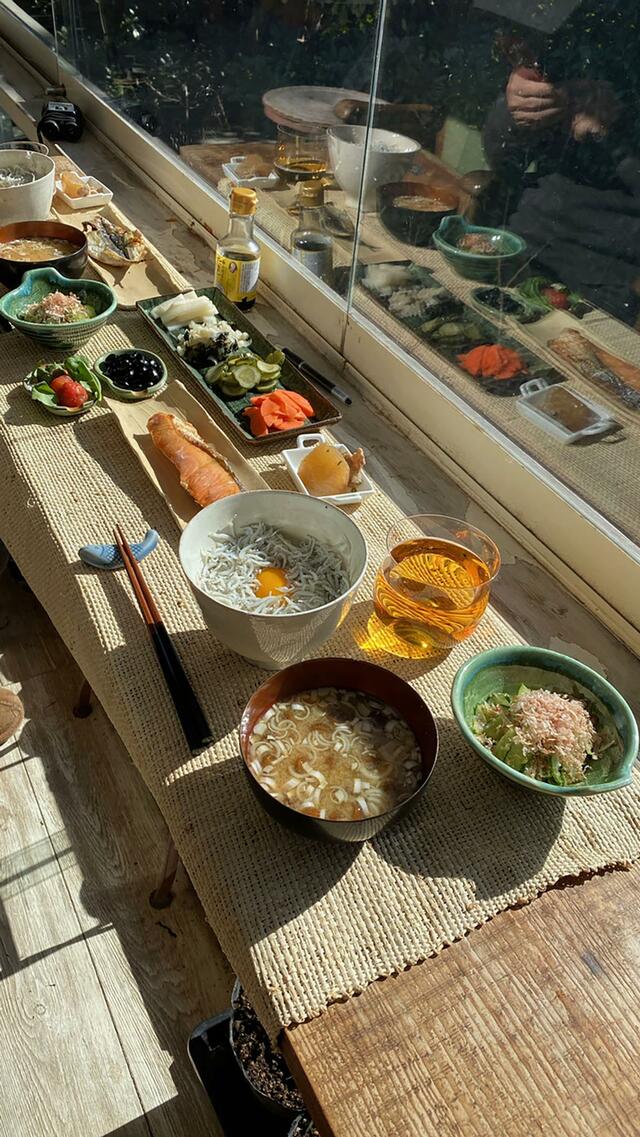 釜揚げしらすご飯、塩鮭、鯵の干物、きゅうり揉み、なめこの味噌汁、糠漬け、