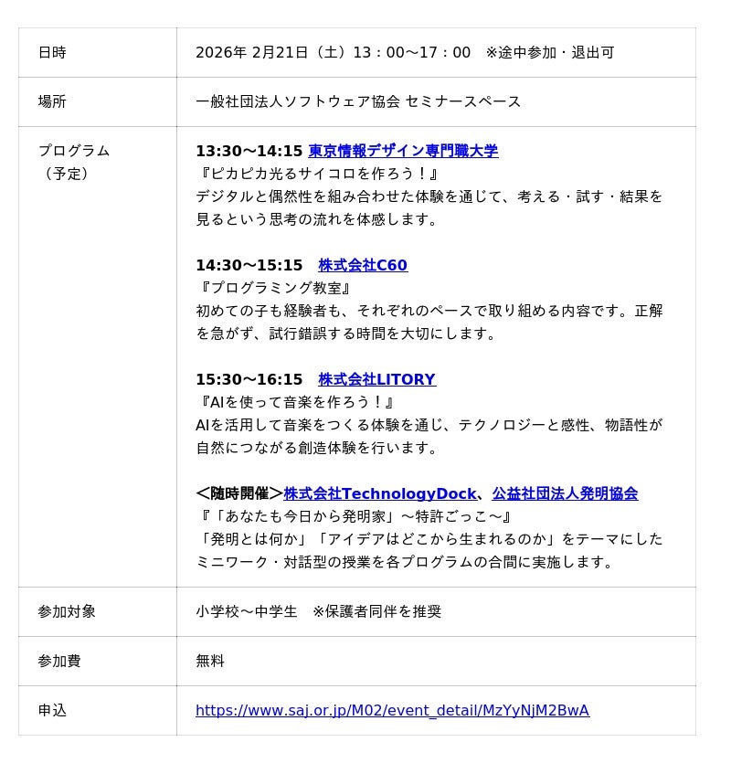 一般社団法人ソフトウェア協会(以下、SAJ)ワクワクする学び場創造研究会は、2026年2月21日(土)、親子で参加できる体験型イベント『アゲイン・アゲイン・プロジェクト イベント』を開催します。
