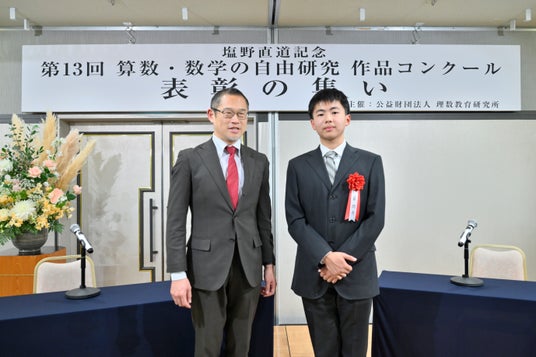 算数・数学の実用的な技能を測る、実用数学技能検定「数検」(数学検定・算数検定、以下「数検」)を実施・運営している公益財団法人日本数学検定協会(所在地:東京都台東区、理事長:高田 忍、以下「当協会」)は、公益財団法人理数教育研究所が主催している「塩野直道記念 第13回『算数・数学の自由研究』作品コンクール」(通称「MATH(マス)コン」)の優秀賞の1つである「日本数学検定協会賞」を決定し、2025年12月21日(日)に東京都内で行われた表彰式で受賞者を表彰いたしました。