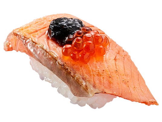 塩を振って炙った人気ネタの大切りサーモンに、濃厚な海苔の佃煮と鱒いくらを合わせ、宮城県の郷土料理である「はらこ飯」風に仕上げました。
