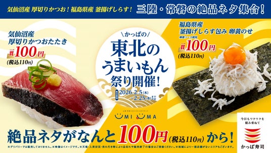 コロワイドグループのかっぱ寿司(カッパ・クリエイト(株) 本社:神奈川県横浜市、代表取締役社長:山角豪)は、2026年2月5日(木)~2月25日(水)の期間、「かっぱの東北のうまいもん祭り」をかっぱ寿司全店にて開催いたします。