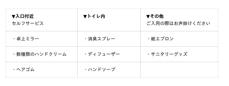 なお、本店舗は『女性おもてなし推進店』ではありますが、これら全ては女性以外のお客様にもご利用いただけます。