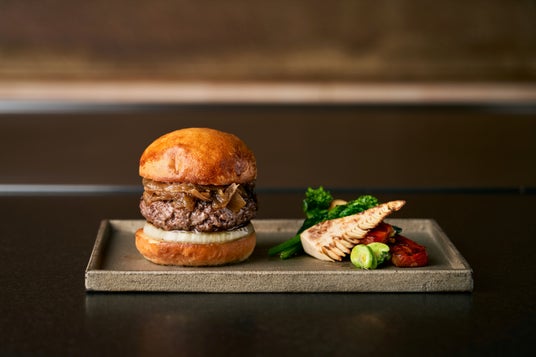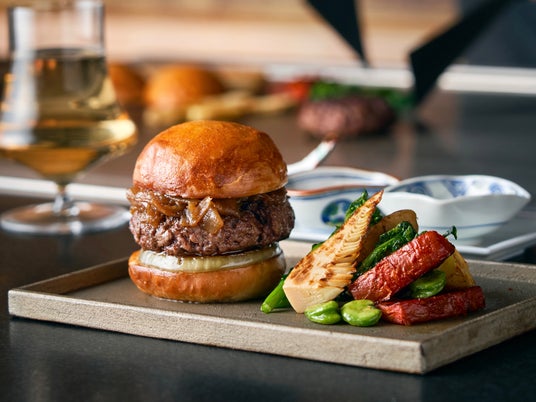 京都のブランド牛をはじめとするシェフ厳選の和牛を使ったパティと旬の野菜を目の前の鉄板で丁寧に焼き上げた一品です。焼き野菜は、そのままでも、お好みでハンバーガーに挟んでもお楽しみいただけます。こだわりの器と全席カウンターの空間で特別な食体験をご提供します。