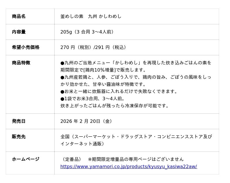 総合食品メーカー、ヤマモリ株式会社(本社:三重県桑名市、社長:三林 圭介)は、好評販売中の釜めしの素「九州 かしわめし」の具を2026年2月20日(金)より期間限定で10%増量して販売します。釜めしの素は、初めてお料理をする方でも失敗なくおいしく作れるので新生活を迎える方にはぴったりです。