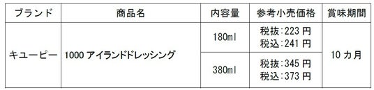 「キユーピー 1000アイランドドレッシング」は、1963年にキユーピーがフレンチドレッシング(赤・白)に次いで3番目に発売したドレッシングです。ピクルスの風味が楽しめるクリーミーな味わいで、現在では昔から親しまれている定番の赤キャップシリーズの中で売上構成比No.1のフレーバーです。幅広い世代のお客さまに支持されている一方で、長い間、味わいの変更をしていなかったため、嗜好の変化を踏まえ、リニューアルを行いました。