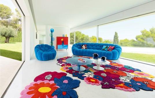 今回のコラボレーションでは、彼の作品の象徴的なイメージやポスターがあしらわれたソファ「LOUNGE」やチャイナユニット「RONDO 2」、彼がセレクトしたカラー展開によるカクテルテーブル「OVNI UP」、彼の世界観を彷彿とさせる、ラグやクッションコレクションなどのオリジナルデザインを展開。さらに、ブランドのアイコン的ソファ「BUBBLE」の誕生10周年を記念して、彼が厳選した特別なコラボレーションカラーが登場しています。