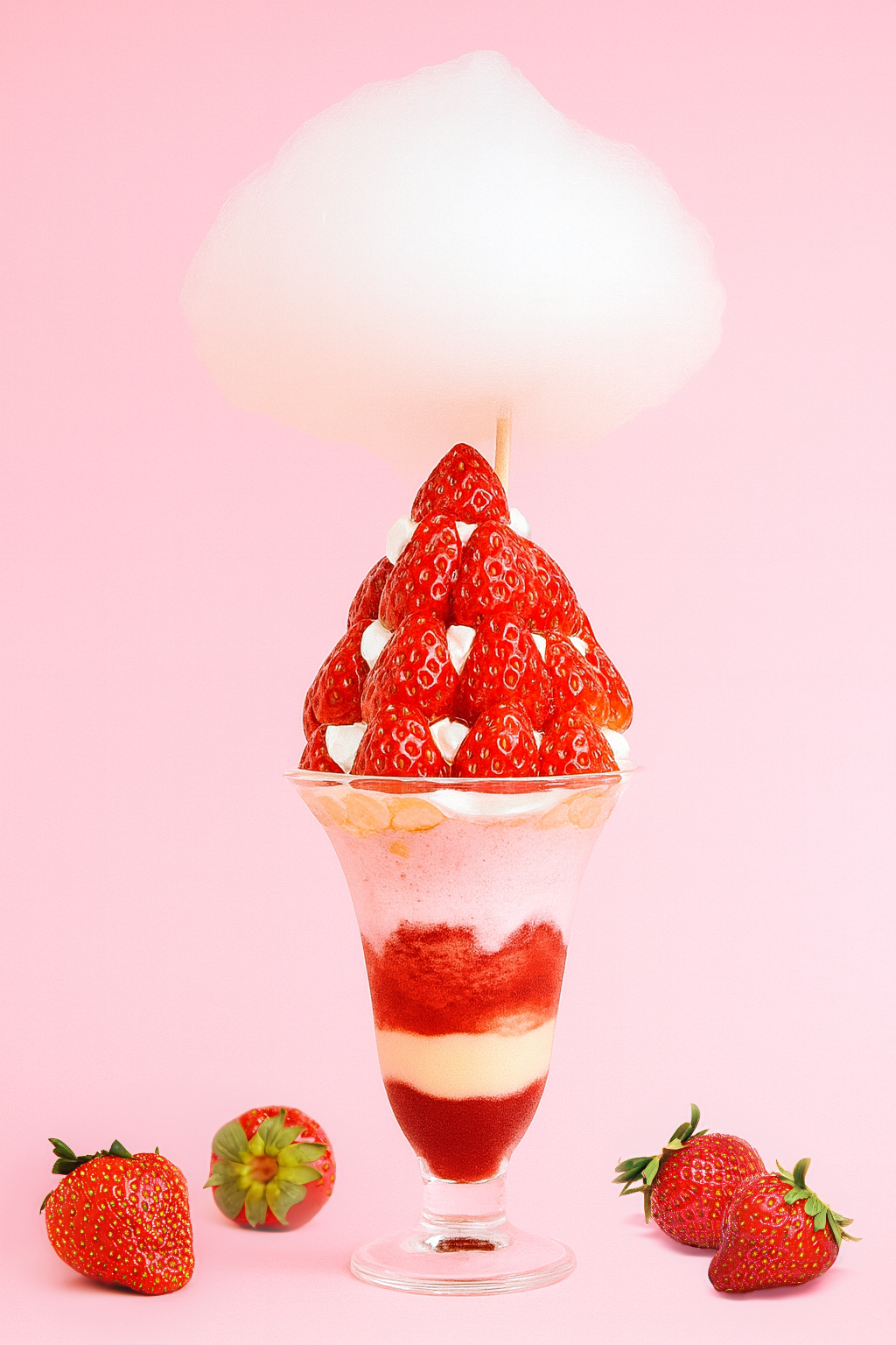 贅沢いちごの食べ比べマウンテンパフェ(ふるーつなのに)異なる品種のいちごを贅沢に使用した“いちご尽くし”の食べ比べパフェ。自家製いちごソースとムース、フレッシュいちごを山盛りに重ね、ふんわりホイップと大きな綿飴でトッピング。⽢酸っ