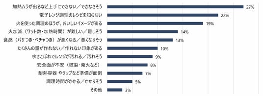 電子レンジ調理をしない人にしない理由を聞いたところ、「加熱ムラが出るなど上手にできない/できなさそう」、「電子レンジ調理のレシピを知らない」、「火を使った調理のほうが、おいしいイメージがある」という理由が上位となりました。