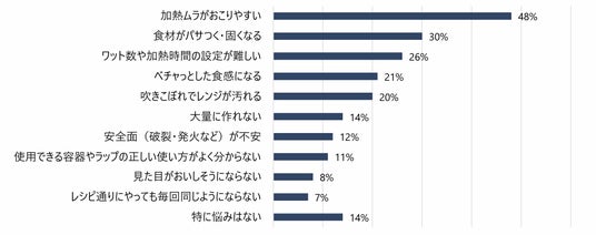 同調査で、電子レンジ調理をするとき、どのようなことに悩みや不満を感じるか質問したところ、約48%の人が「加熱ムラがおこりやすい」と回答。次いで「食材がパサつく・固くなる」、「ワット数や加熱時間の設定が難しい」といった回答が続きました。